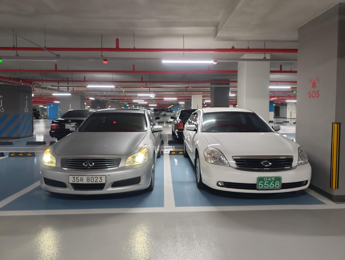 몇 주 전 구매한 G37과 나란히 세워놓은 모습입니다. 둘 다 비슷한 시기에 판매된 비슷한 크기의 닛산 혈통의 차량입니다. 하나는 고출력 후륜에 드리프트까지 가능한 반면, 하나는 100마력 초반 전륜바리 수동 차량이지만요.