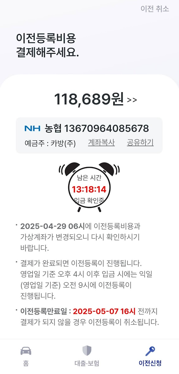 단, 오후 4시 이전에 신청해야 당일 이전이 완료되고, 그 이후라면 익일 오전에 진행됩니다. 아쉽게도 4시 살짝 넘어 이전신청을 해서 다음날이 되어야 이전이 완료될 예정. 판매자분이 이전 완료되기 전까진 키를 넘겨주기 어렵다 하셔서 탁송은 다음날 받아보기로 했습니다.