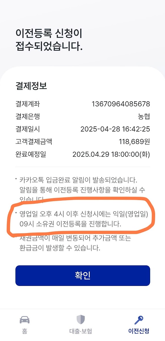 단, 오후 4시 이전에 신청해야 당일 이전이 완료되고, 그 이후라면 익일 오전에 진행됩니다. 아쉽게도 4시 살짝 넘어 이전신청을 해서 다음날이 되어야 이전이 완료될 예정. 판매자분이 이전 완료되기 전까진 키를 넘겨주기 어렵다 하셔서 탁송은 다음날 받아보기로 했습니다.