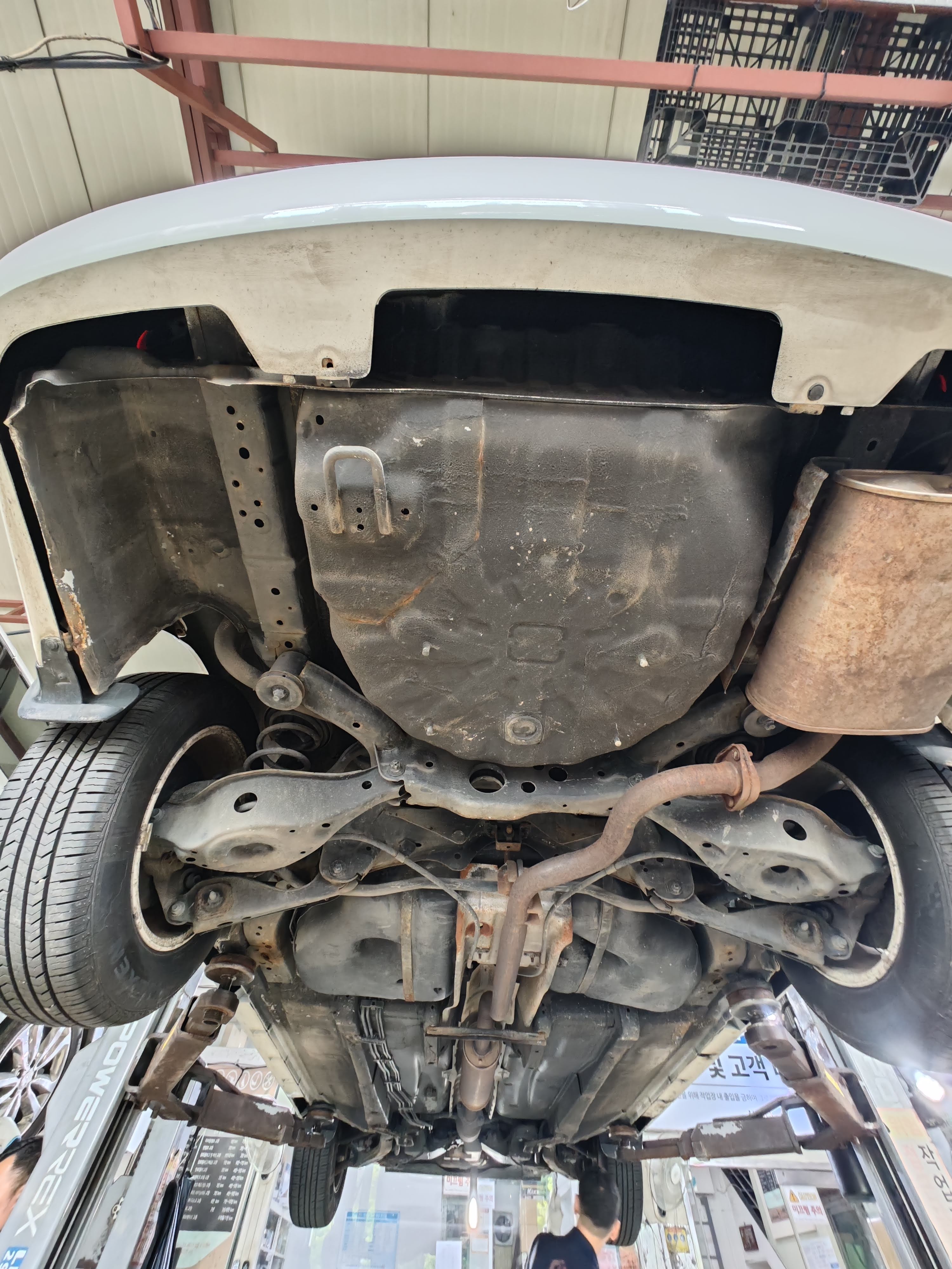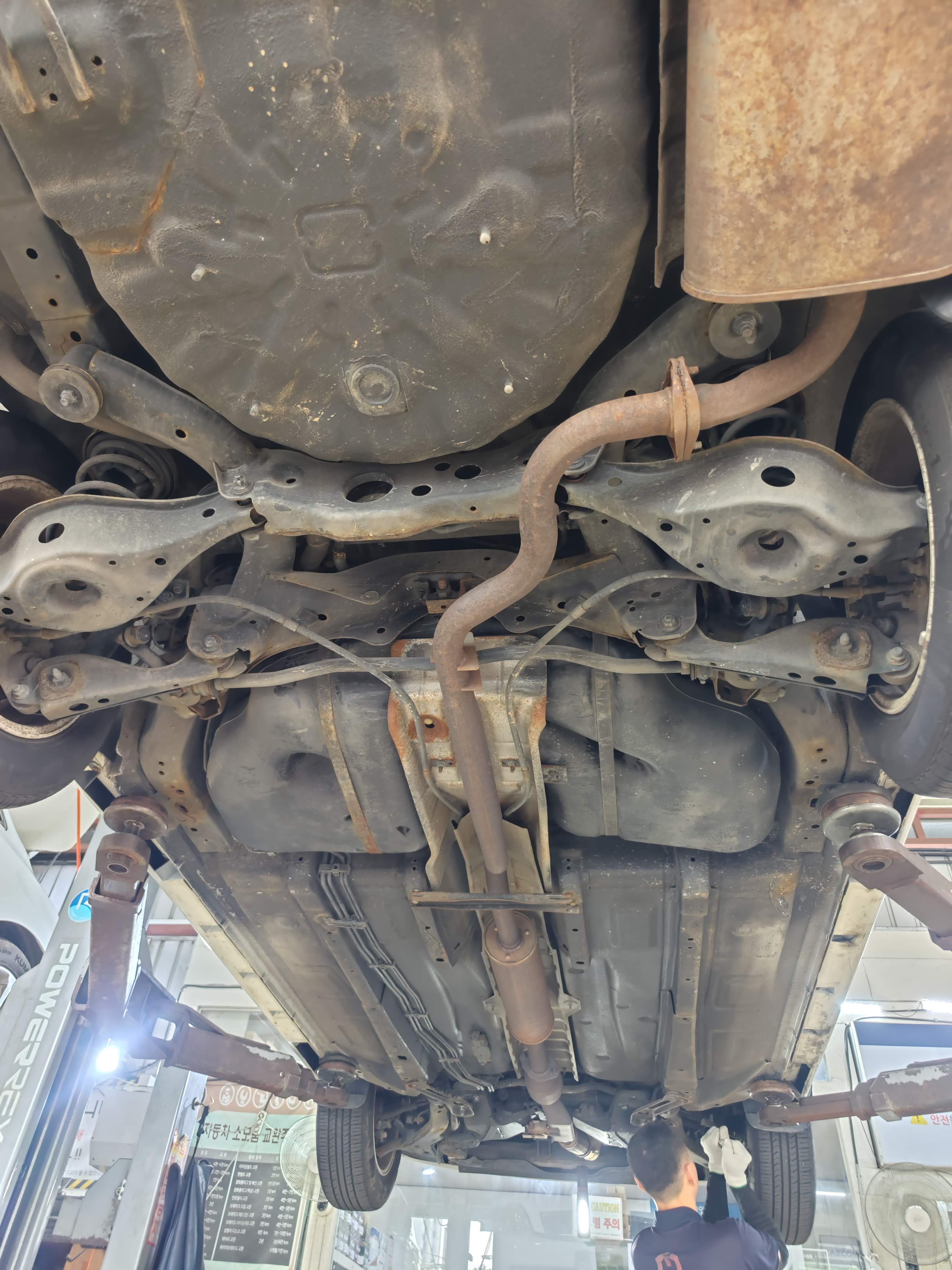 리프트에 올린 김에 하부 상태도 점검해 봅니다. 녹이 전혀 없는 것도 아니지만, 20년된 차량임을 감안하면 굉장히 심한 편은 또 아닌 애매한 상태입니다.