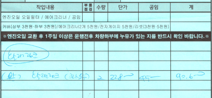 비용은 부품 22800 x 2(좌우) = 45600원에 공임 45000원 해서 총 90600원이 나왔습니다.