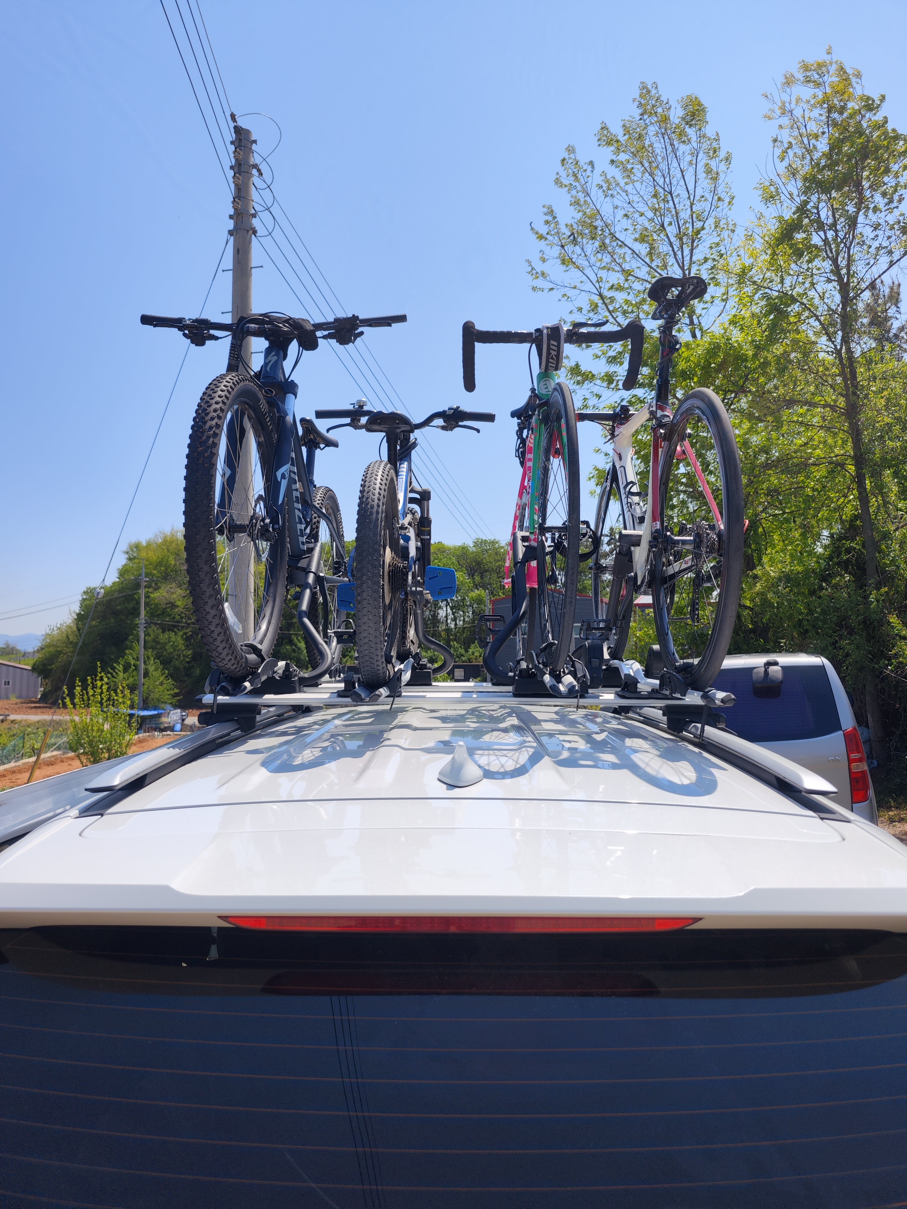 자전거 캐리어도 8년 후배인 카니발이 물려받았구요. 루프랙 좌우 폭이 카니발이 좀 더 넓습니다. 기존 툴레 132cm 짜리 가로바가 살짝 짧네요. 하지만 장착이 가능하긴 해서 일단 달아두었습니다. 여튼, 카니발 4세대 기준, 132cm 는 짧고 150cm 짜리가 딱 맞는 사이즈라는 점 참고하세요.