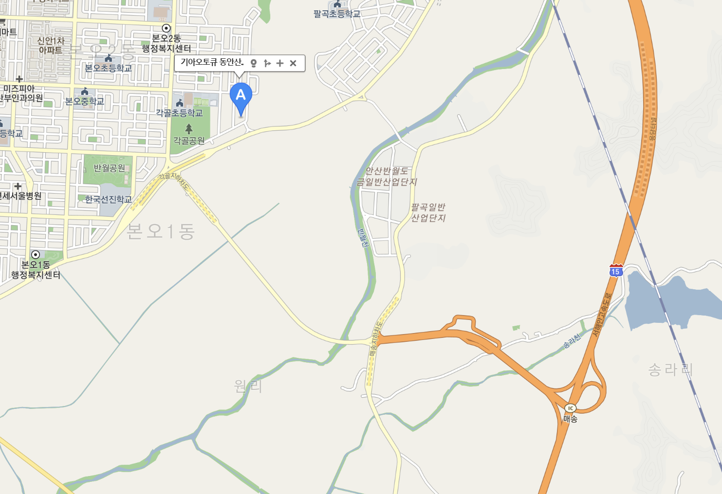 서해안고속도로 매송IC에서 그리 멀지 않은 곳에 있습니다. 갈 땐, '팔곡일반산업단지'를, 올 땐 '각골공원'쪽을 거치는 반시계방향 루트를 이용하는게 좋습니다.