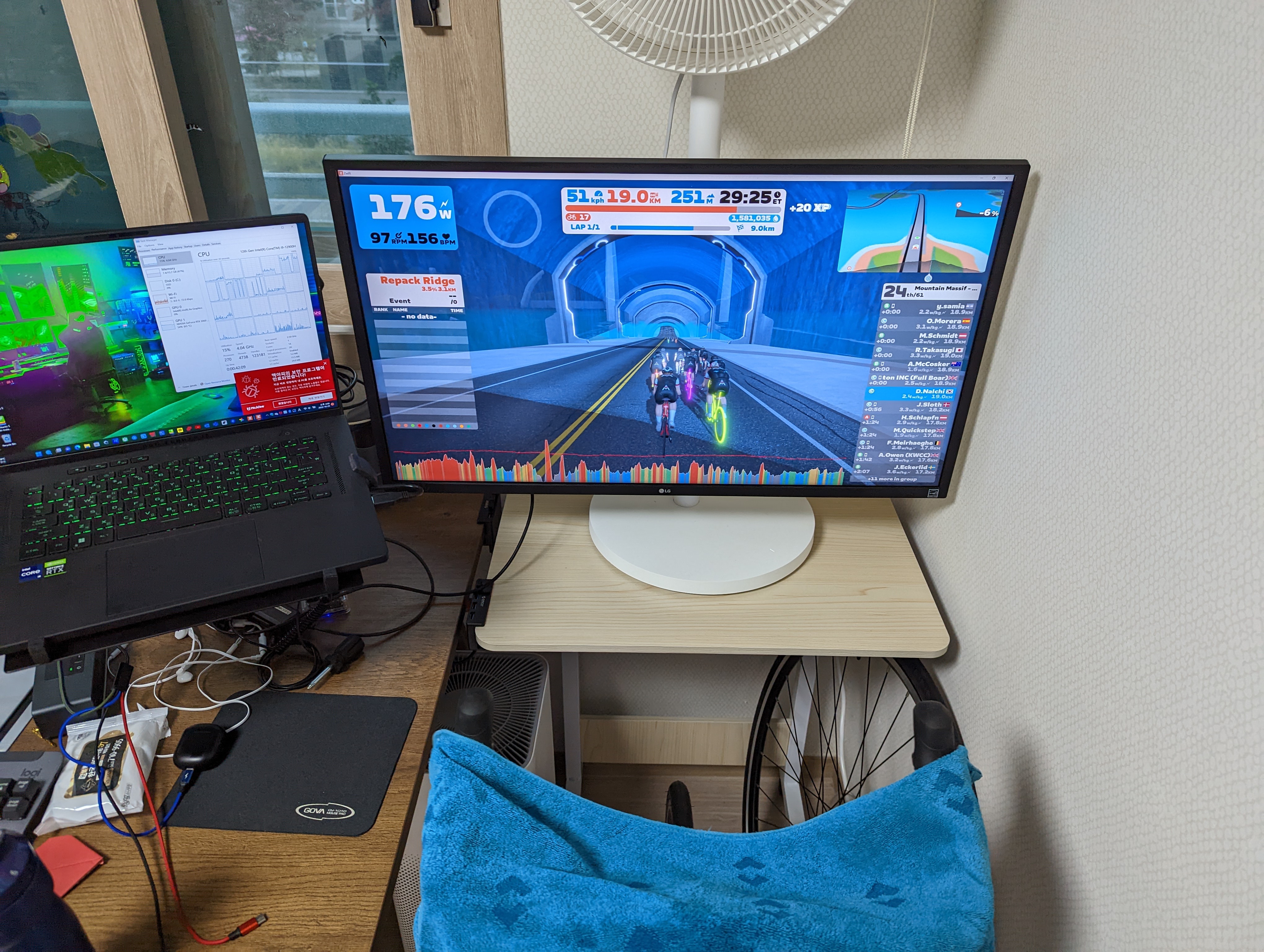 상체를 꽤나 숙이고 타야하는 로드 자전거의 특성 상 노트북을 가급적 낮은 위치에 두어야 합니다. 그런데 바닥에 둔 선풍기 바람을 노트북이 일부 가려버리는 문제가 있네요. 아래에서 불어오는 선풍기 바람으로는 머리쪽을 식히지 못하니 꽤 난감했습니다.