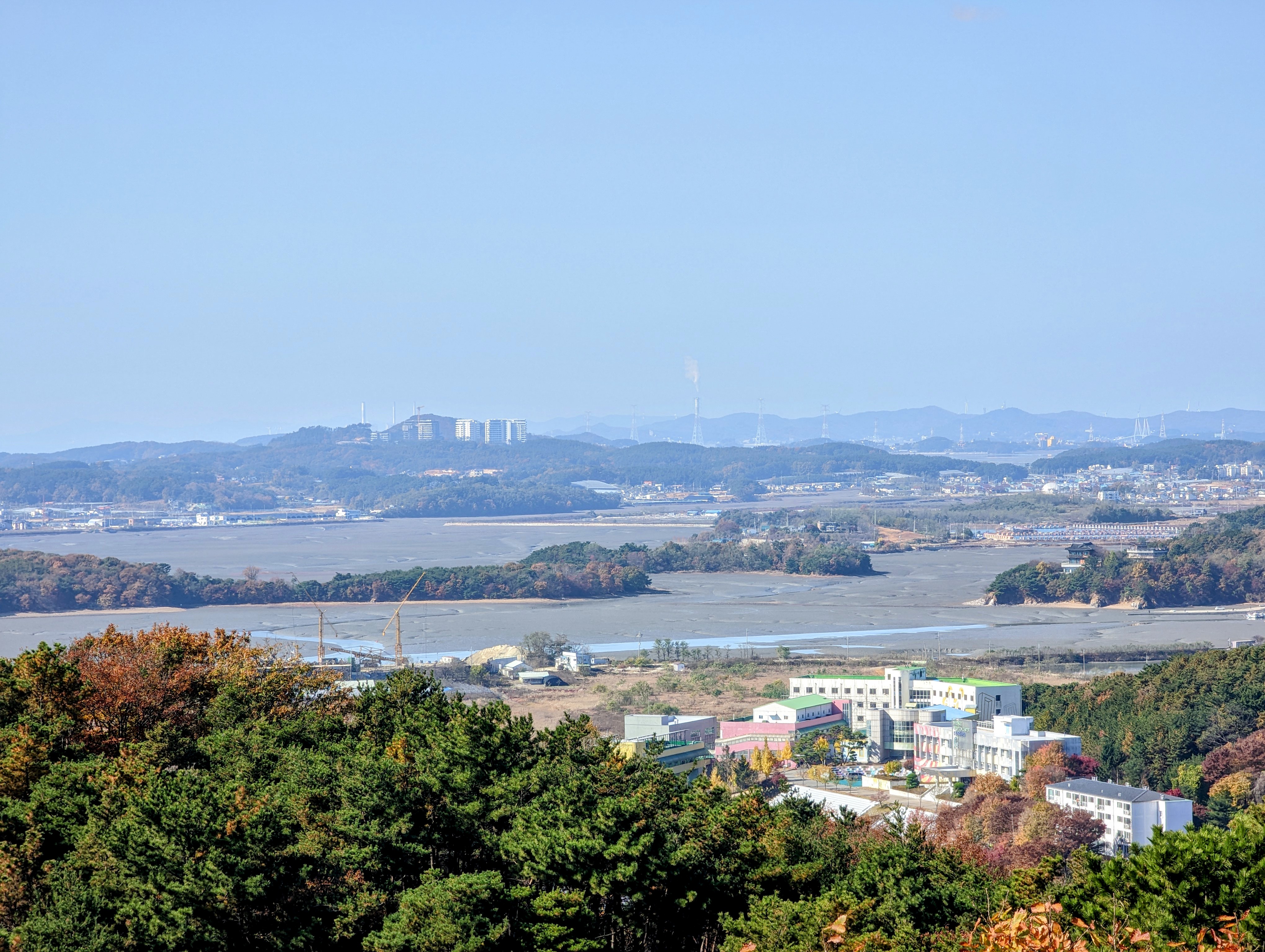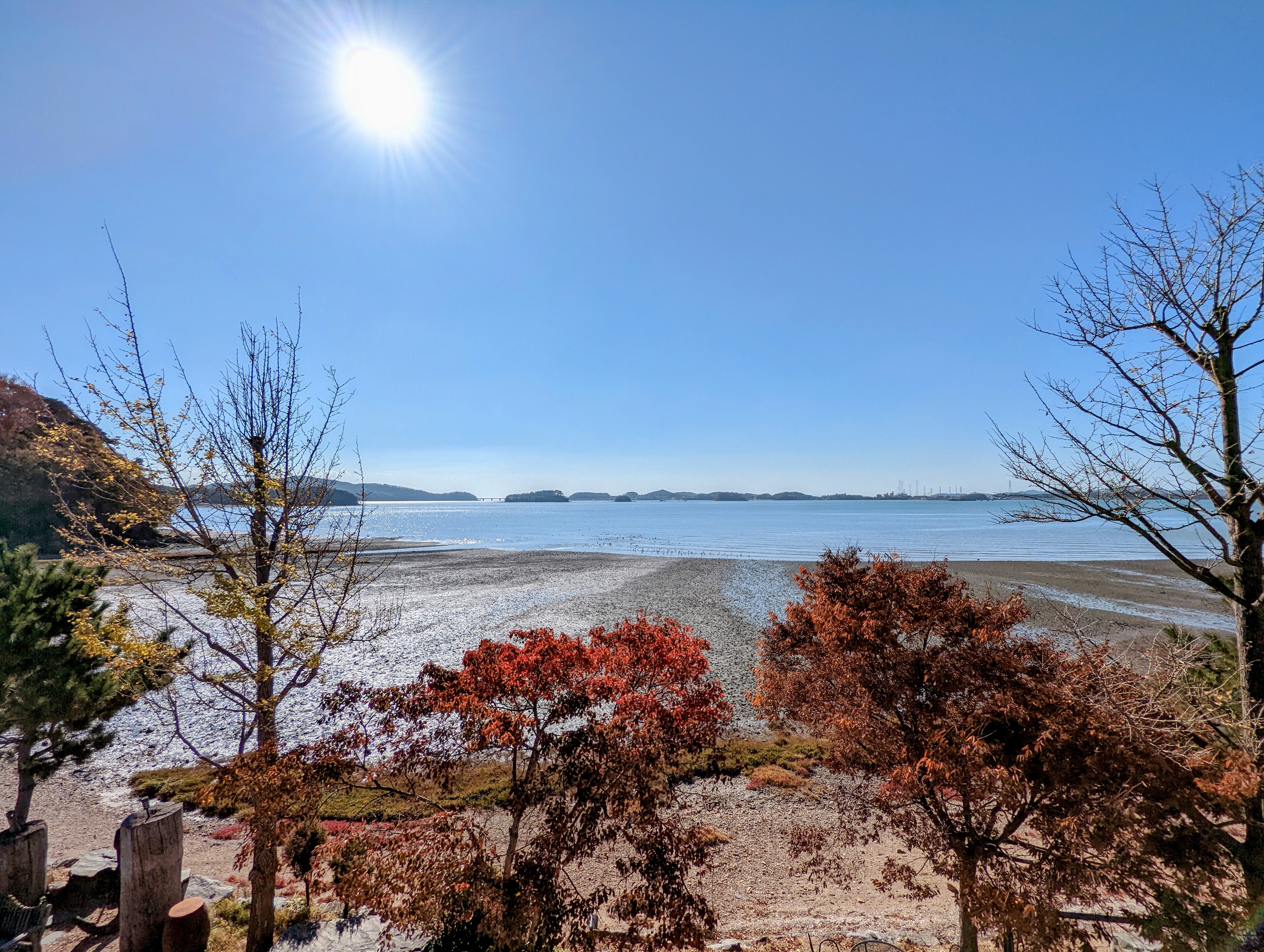 예쁘게 물든 단풍에, 잔잔한 바다, 갯펄, 따스한 햇볕. 모든게 적당히 조화롭네요. 굿굿.
