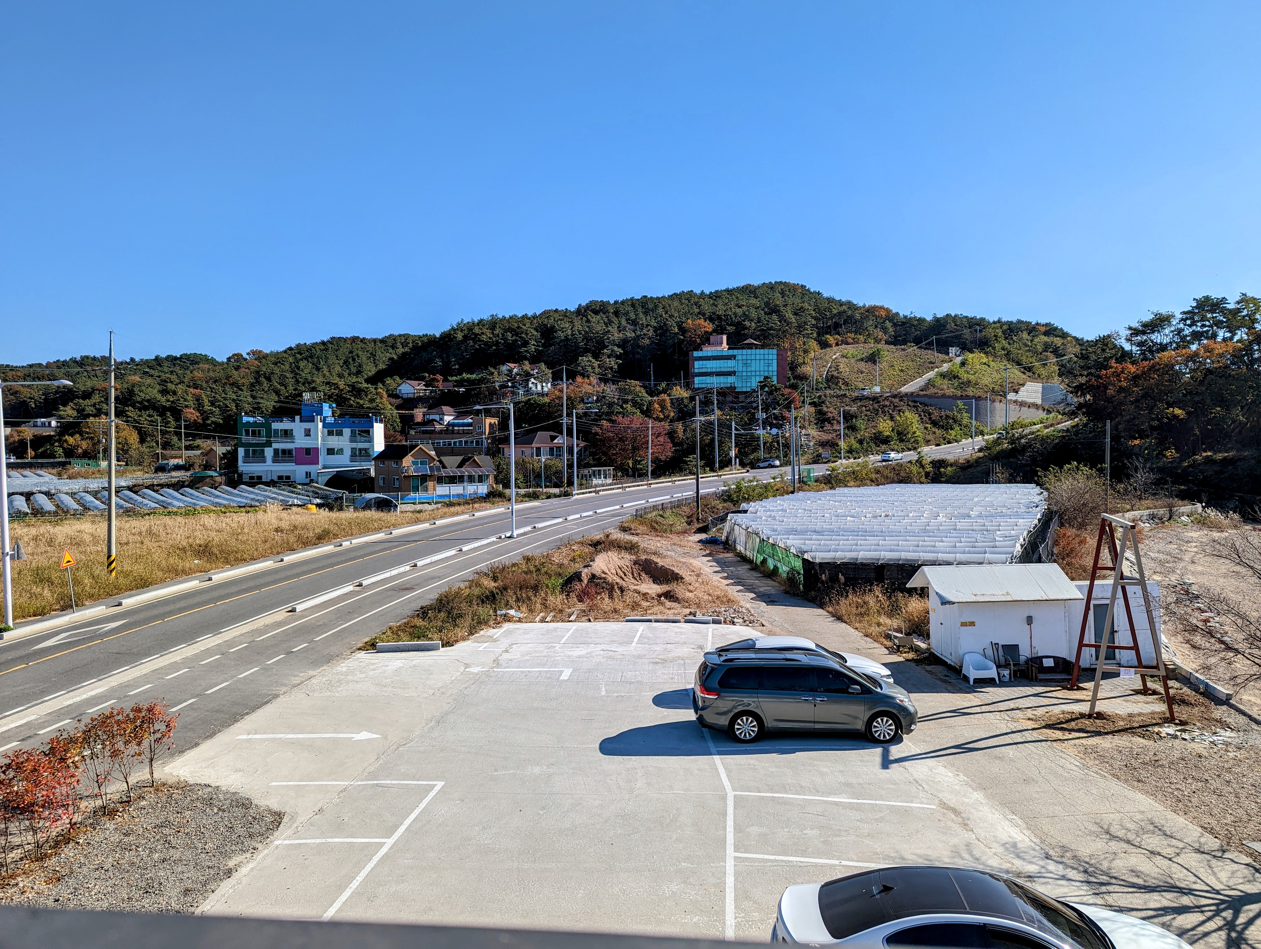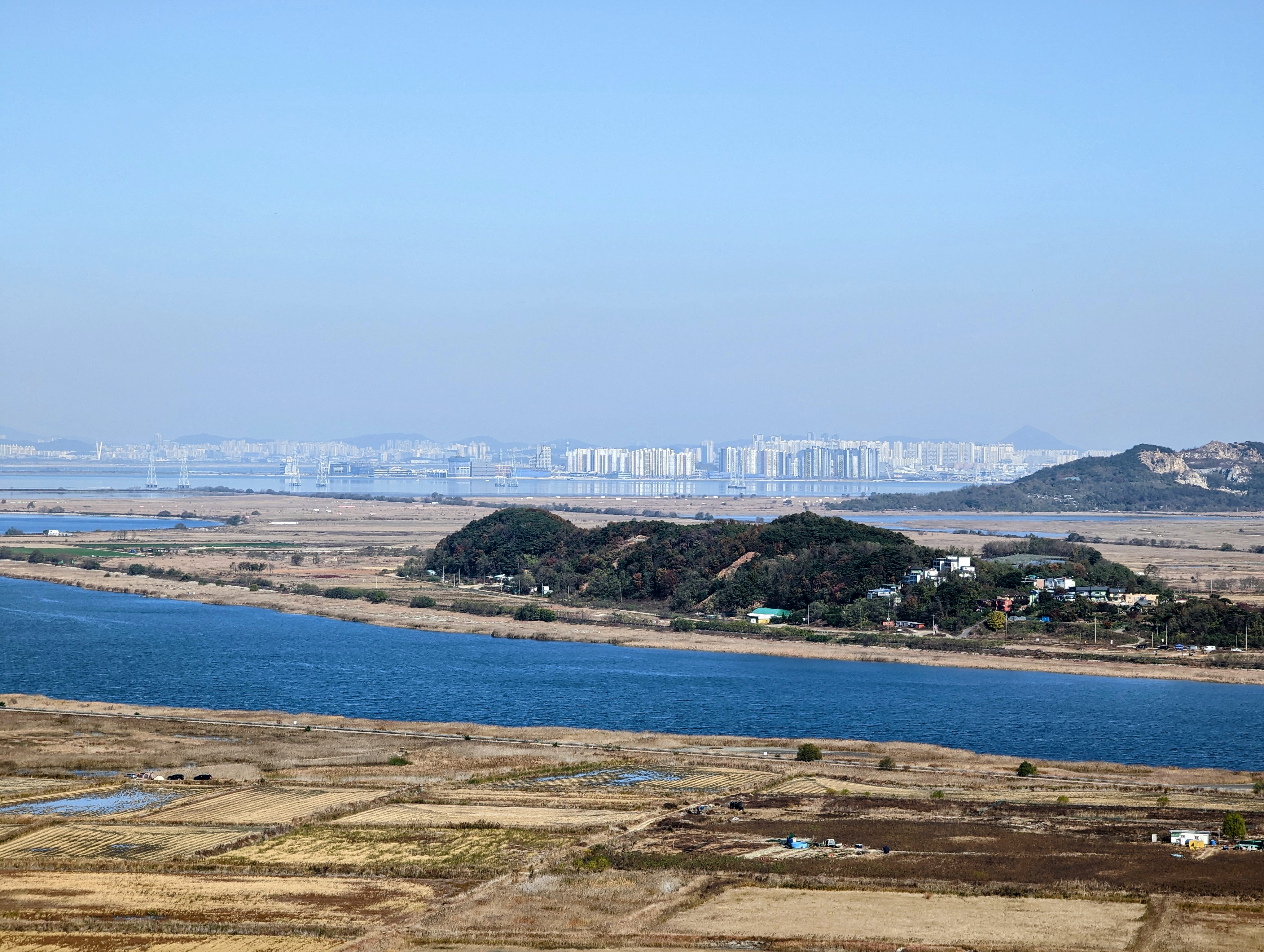 가까이 보이는 동네 뒷산과 주변 평지는 시화방조제가 들어서기 전엔 갯뻘과 섬이었습니다. 방조제 덕분에 수위가 오르내리지 않게 되니 농사 지을 수 있는 땅이 된 것이겠죠.