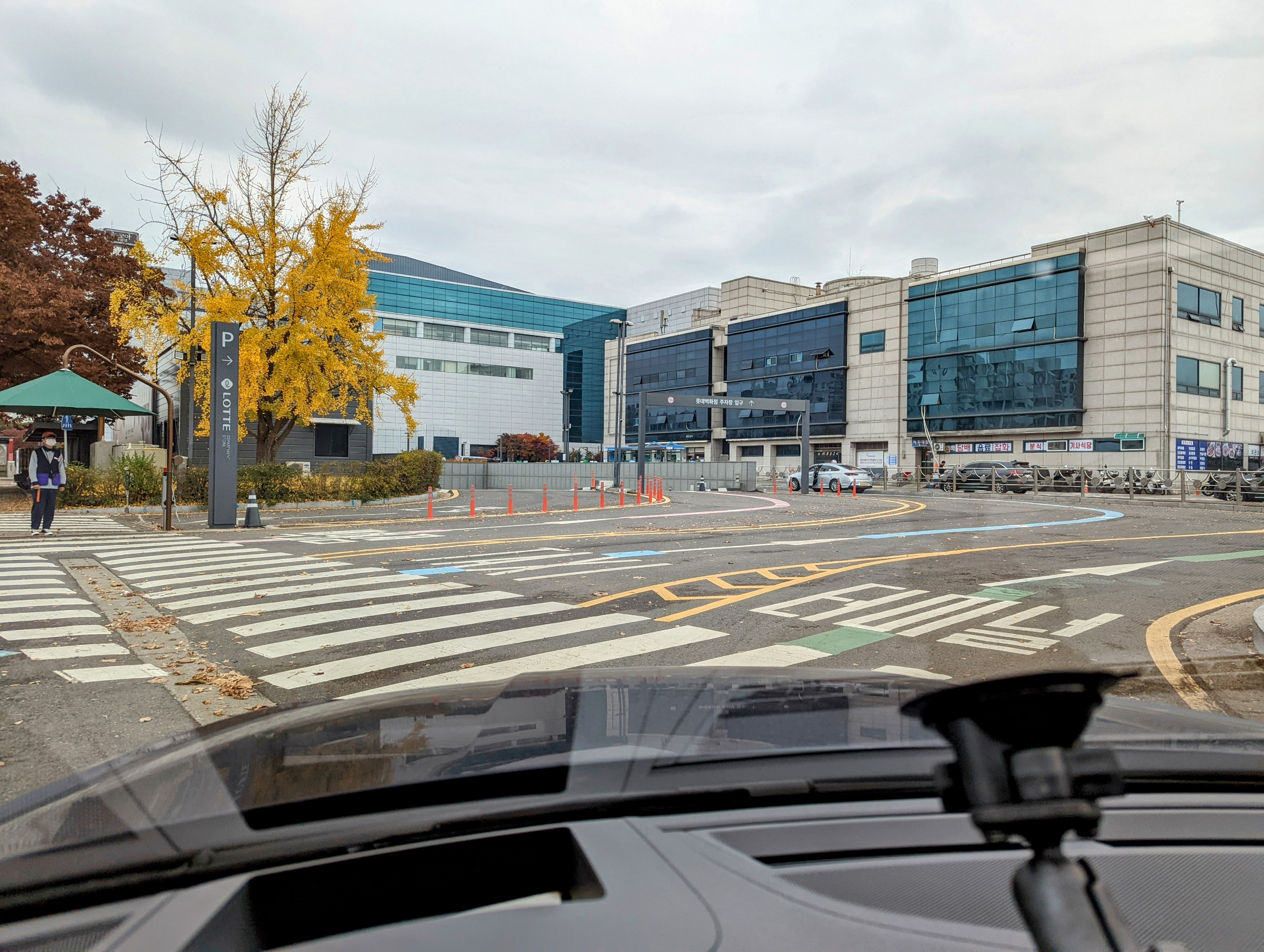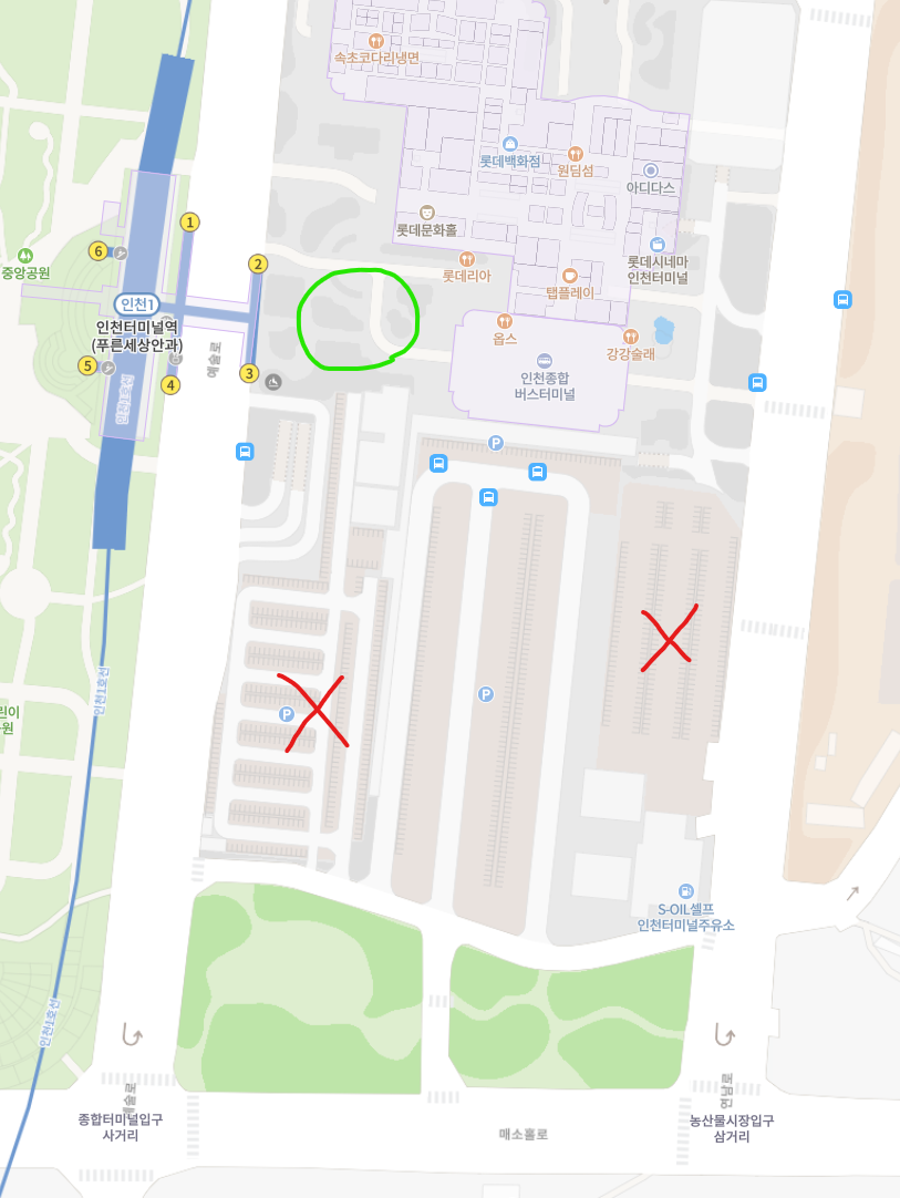 초록색 라인을 따라 주차장으로 진입합니다. 분홍색 라인은 백화점입니다.
