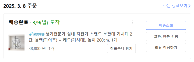 2025년 3월 8일 주문, 3월 9일 받아본 실내 자전거 거치대 제품입니다.