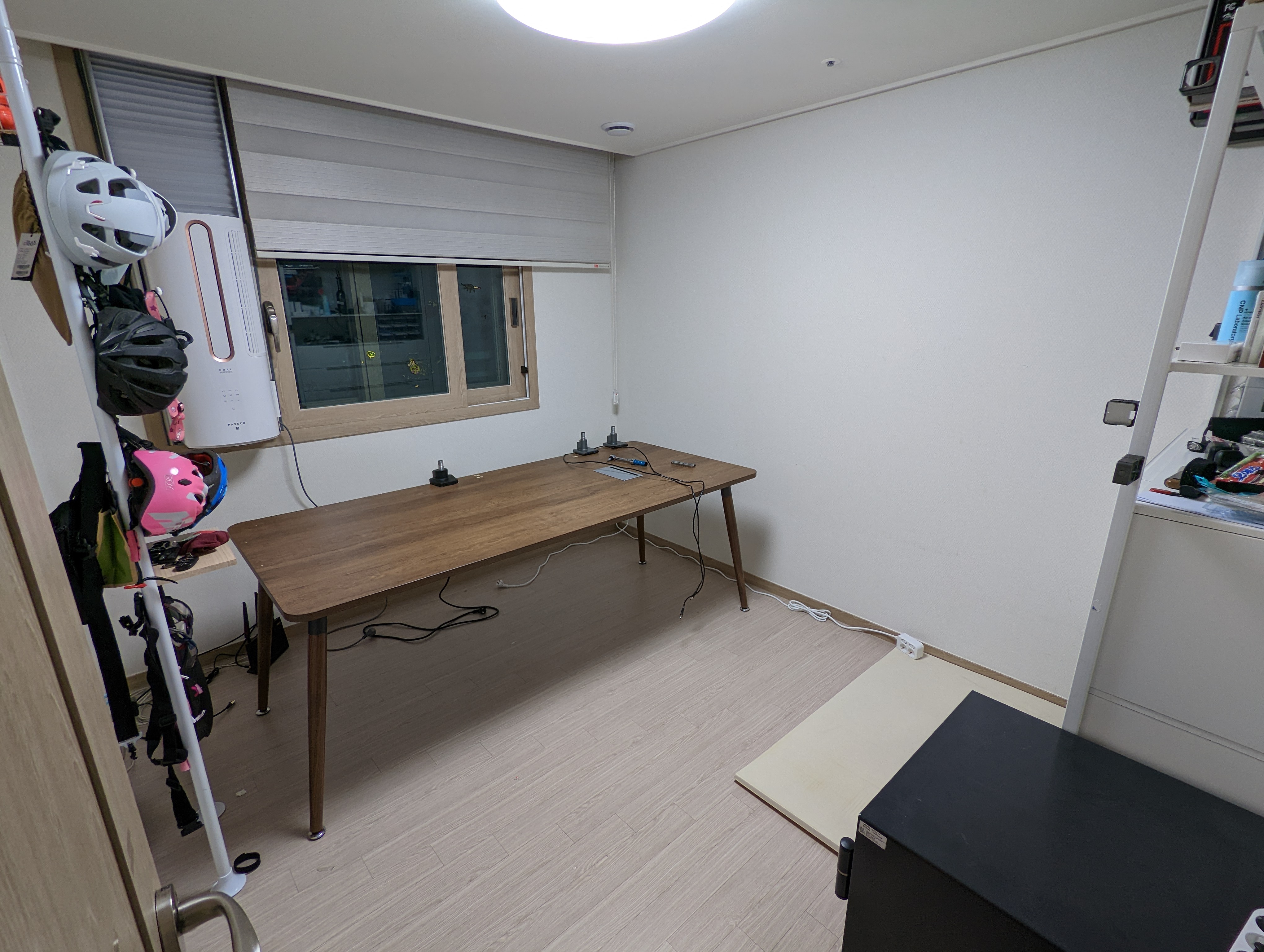 헬멧 등을 걸어두는 '매직파티션'은 문 바로 옆 금고가 있었던 자리로 이동했고, 원래 자리는 필드용 자전거 거치대가 차지했습니다. 금고 문을 막는 위치긴 하지만, 1년에 금고 열어보는게 몇 번 안되니 당장 문제가 되진 않습니다. 그래도 영원히 저렇게 둘 순 없을테고, 정비대 스타일의 거치대는 퇴역 처리를 하는게 맞을 것 같습니다. 자전거를 벽에 붙여 걸어놓을 수 있는 스타일의 거치대를 하나 장만하게 되지 않을까 싶습니다.
