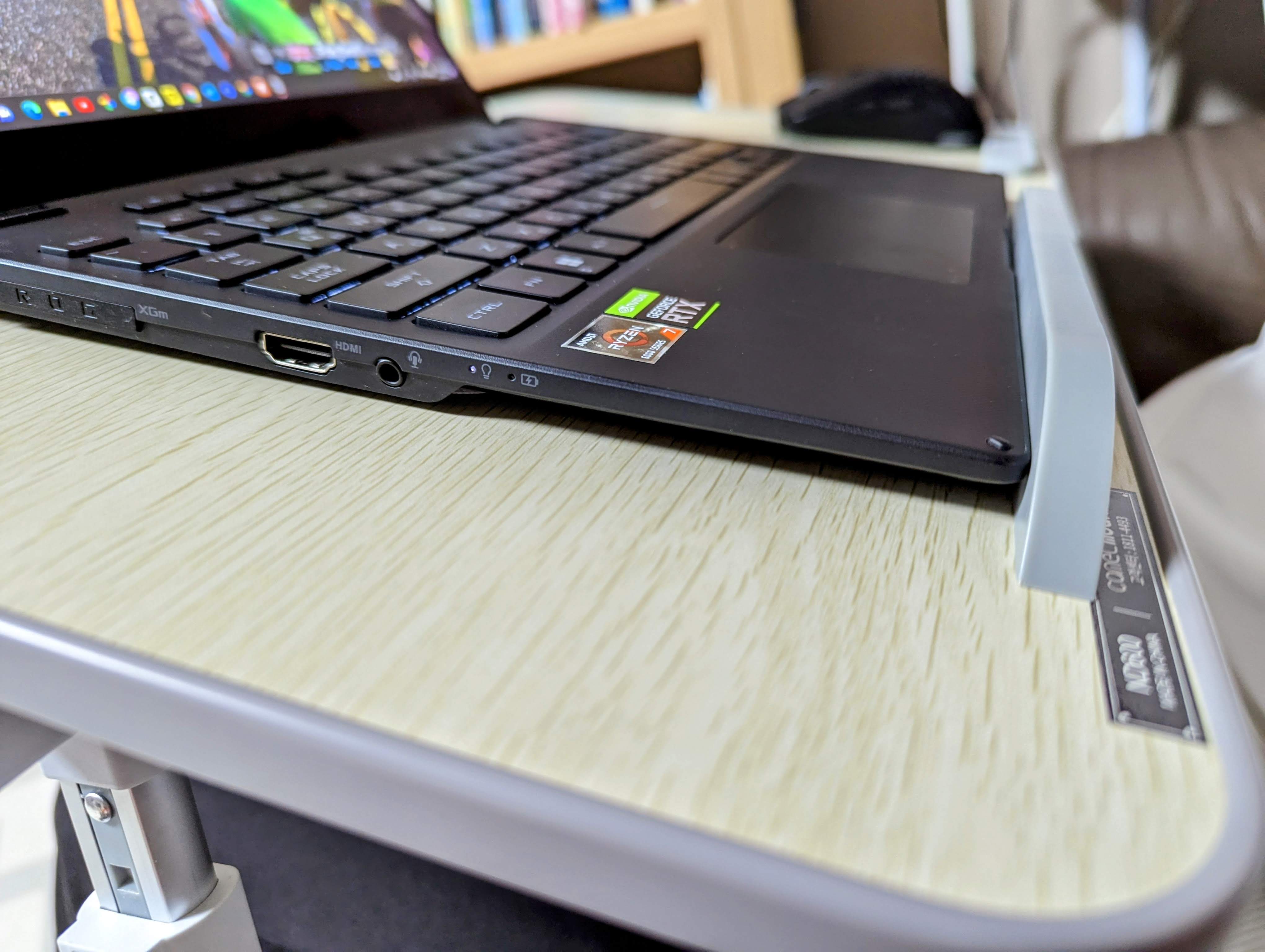 그런데 스토퍼의 위치가 애매합니다. 오른쪽에 마우스를 위한 공간이 필요한 건 맞는데, 그와 비슷한 면적을 왼쪽에도 확보해 두었면 두었지, 노트북을 몸 중심에서 왼쪽으로 치우치게 해놓고 사용하는 경우는 잘 없거든요. 그런데 스토퍼의 위치를 보면 노트북을 왼쪽에 놓고 사용하라는 의도가 보입니다.