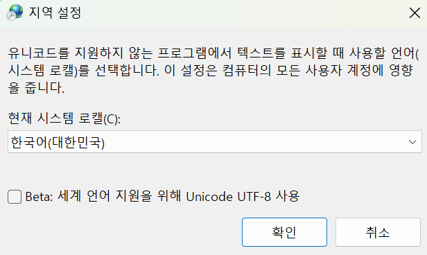 - 팝업 창 하단의 "유니코드 UTF-8을 위한 베타 설정(Beta: Use Unicode UTF-8...)" 옵션을 체크 해제합니다.